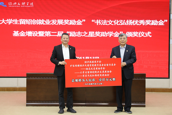 11月13日下午,“大学生留绍创就业发展奖励金”“书法文化弘扬优秀奖励金”基金增设暨第二届“励志之星奖助学金”颁奖仪式在威尼斯官网图书馆一楼报告厅举行。绍兴市委统战部常务副部长黄浙平、绍兴旅港同乡会会长严建国、绍兴市委统战部港澳台和侨务工作处处长童斌、绍兴旅港同乡会常务副会长毛宇峰,校党委书记汪俊昌、副书记沈赤,校相关职能部处负责人,相关二级学院副书记,第二届“励志之星奖助学金”获奖学生代表等参加仪式。