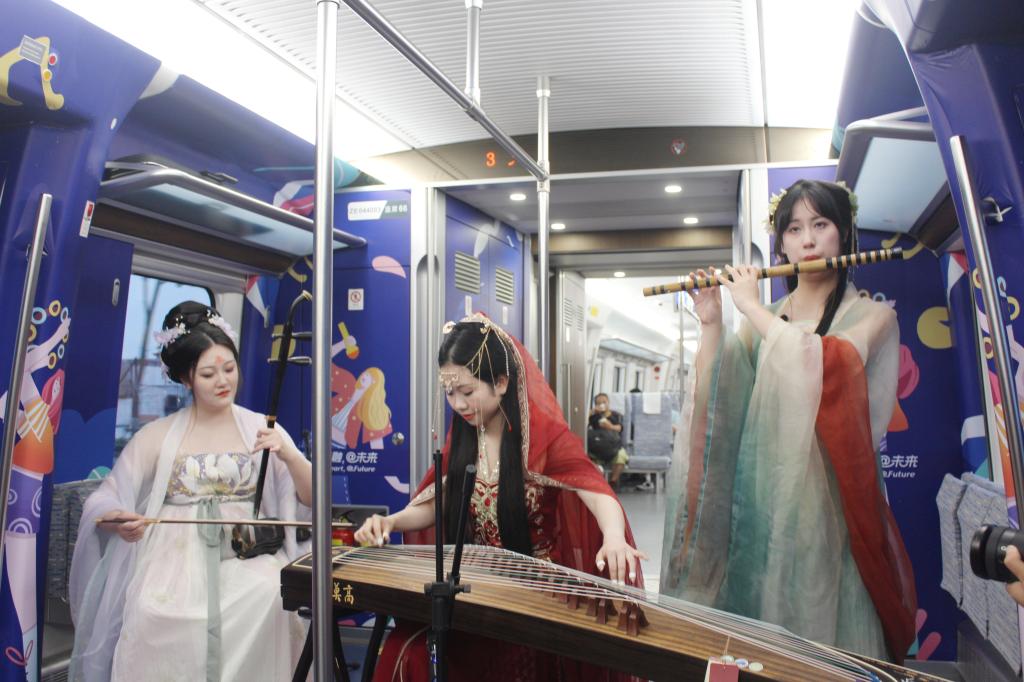 7月1日傍晚,一班由杭州南站开往绍兴迪荡站的城际列车车厢内时不时传来袅袅余音和热烈掌声。着眼望去,一群身着汉服的年轻人抚琴奏歌,唱响亚运乐章。