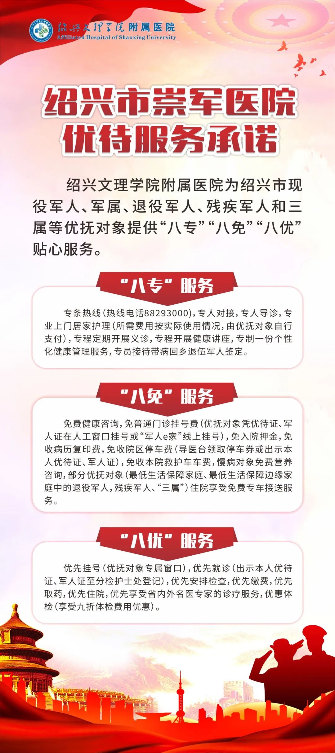 夏瑞明书记介绍了“八专”“八免”“八优”服务的具体内容。他表示,医院将充分发挥专业优势和技术特色,不断创新服务模式,拓展服务领域,提升服务质量,弘扬崇军精神,持续做好医疗拥军工作,用心、用情为现役军人、军属、退役军人、残疾军人和“三属”等优抚对象提供全方位、高品质的医疗服务,提升幸福感、获得感和安全感,奋力开创“双拥”工作新局面。