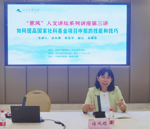 9月20日,“惠风”人文讲坛第三讲在铁城科教馆一楼会议室举行。人文学院教授古大勇、副教授卓光平,商学院副教授赵江,兰亭书法艺术学院副教授石澍生应邀为威尼斯官网师生做了主题为“如何提高国家社科基金项目申报的技能和技巧”的讲座。人文社科处处长诸凤娟主持讲座。