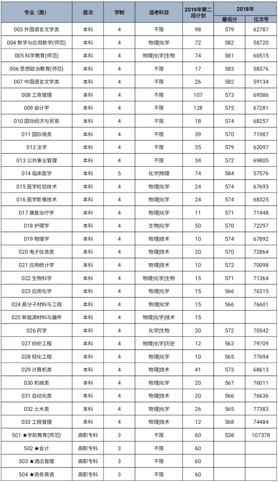 一、普通类第二段招生计划及2018年录取分数