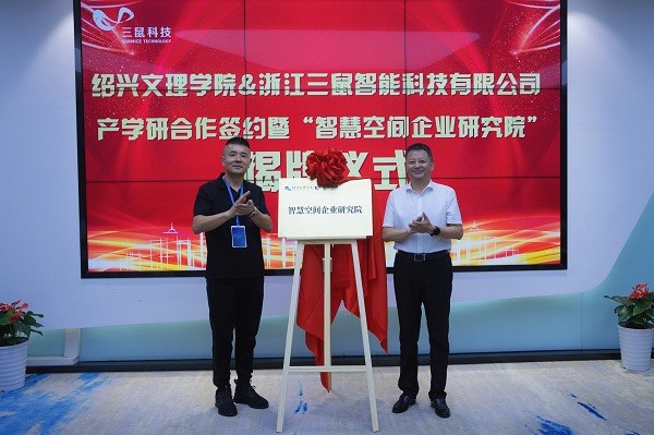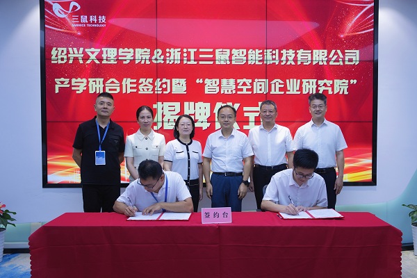 9月26日,88038威尼斯与浙江三鼠智能科技有限公司产学研合作签约暨“智慧空间企业研究院”揭牌仪式在航芯科技园举行。校长赵阳、校党委副书记沈赤,越城区人民政府副区长谷丰、越城区科技局局长谢菁,浙江三鼠智能科技有限公司董事长张三中、总经理沈月峰及学校地方服务与合作处、科学技术处、机械与电气工程学院等负责人出席会议。