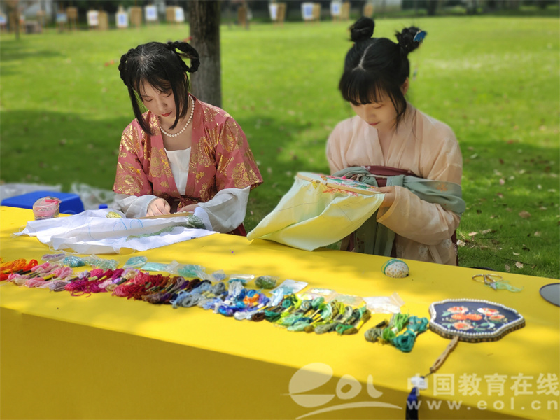 据介绍,这群女生全部来自该校纺织服装学院服装与服饰设计专业,她们正在展示的是《手工刺绣》课程的作业。这些同学将刺绣元素融入服装设计作品,融合现代风格进行创新,希望通过自己的方式传承传统刺绣文化。