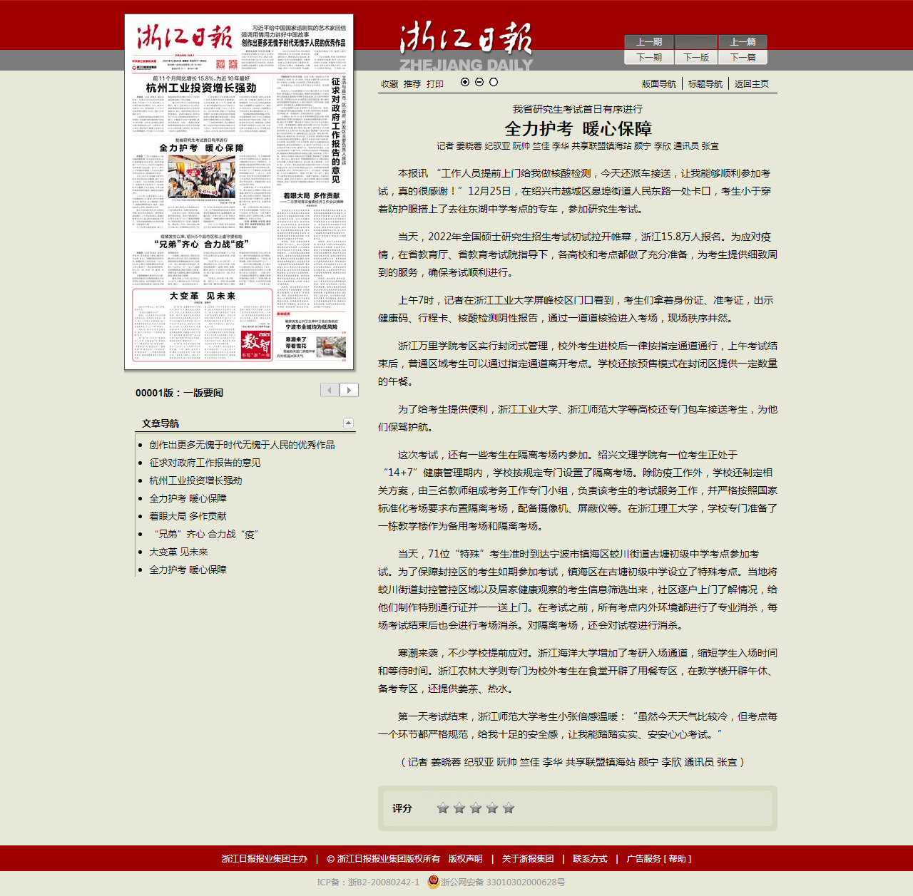 12月26日,浙江日报头版刊登《全力护航 暖心保障 我省研究生考试首日有序进行》,文中列举了威尼斯官网对特殊考生的保障措施。浙江省人民政府官网、新华网、浙江新闻客户端、浙江在线等平台相继转发。