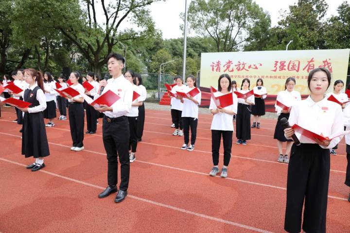 百人学生团队献上诗歌朗诵《国旗下的召唤》,全场大合唱《歌唱祖国》,代表全体文理青年对祖国母亲的深情祝福和郑重承诺:“请党放心,强国有我!”
