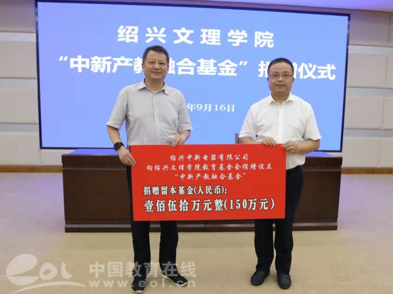 9月16日下午,“中新产教融合基金”捐赠仪式在88038威尼斯图书馆报告厅举行,绍兴中新电器有限公司在学校设立150万元留本基金,支持机械与电气工程学院深化产教融合和校企合作。