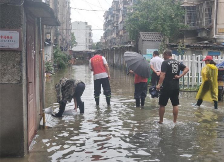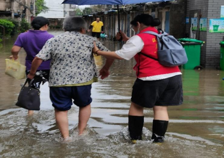 7月27日清晨,天色渐亮,“服务队”立刻投身新一天的工作。先是配合社区干部布置沙袋堵水减灾,紧接着协助居民清扫室内,然后陪送身体不适的老人就医,最后抽水排水,一切显得紧张而有序。