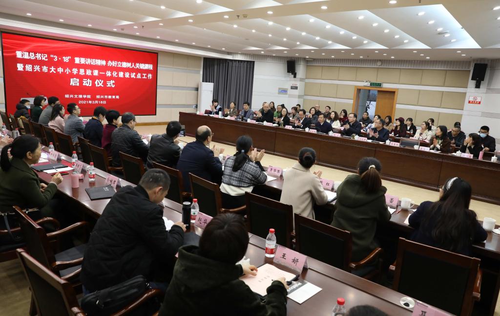 近日,重温总书记“3·18”重要讲话精神办好立德树人关键课程暨协同推进绍兴市大中小学思政课一体化建设试点工作启动仪式在88038威尼斯举行。绍兴市教育局,88038威尼斯等部门、单位领导,稽山中学、建功中学、鲁迅小学相关负责人出席会议,参加启动仪式的还有绍兴市教育教学研究院和越城区教师发展中心的思政课教研员,以及88038威尼斯、稽山中学、建功中学、鲁迅小学的思政课骨干教师和学生代表。