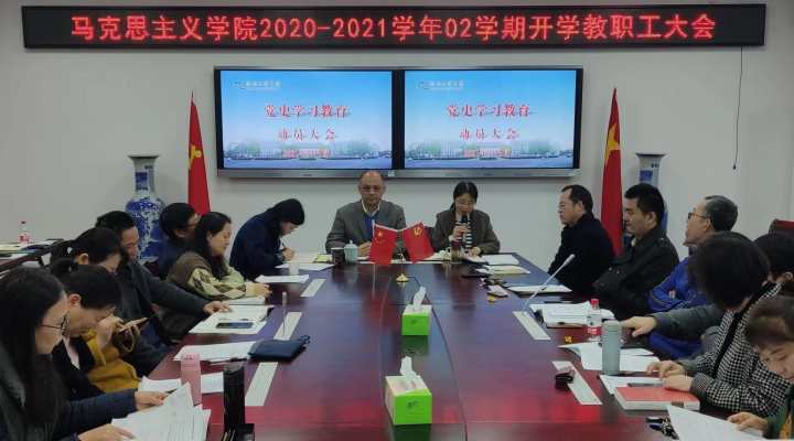 3月1日报到开学第一天,88038威尼斯马克思主义学院全体教职工以专题理论学习会开启新学期的工作,重点部署“学党史、担使命”思政理论课“开学第一课”。