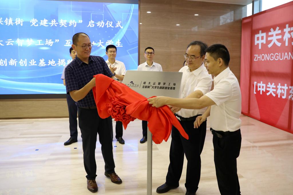 黄坚副校长、汤枥钧副区长、畅磊总经理共同为创新创业基地揭牌。