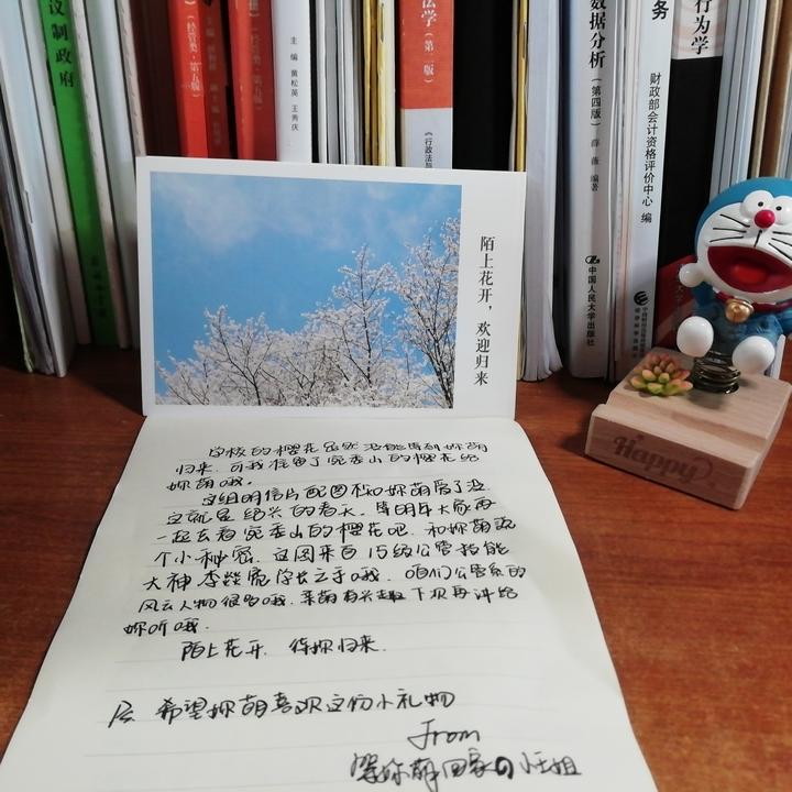 问及为何会准备这样一份礼物,一位学校辅导员说:“一直听学生们说想念学院的樱花,很可惜错过了春天。我就联系了之前公管系一位毕业生,他友情提供照片,我手写心意给返校的公管小朋友们,想告诉他们:你所想所念之风景,有我们寄给你,只因你就是我们心心念念之美景。”