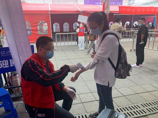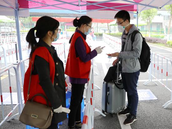 学校实行人流错时错峰抵校和校门口交通协调,自驾车辆即停即行,学生下车后立即进入专有通道。经过身份核实、两次体温检测、手部清洁消毒、更换口罩核验等程序,学生即可入校。进入校区后,工作人员和志愿者们帮助学生搬运行李,核验登记后进入宿舍。