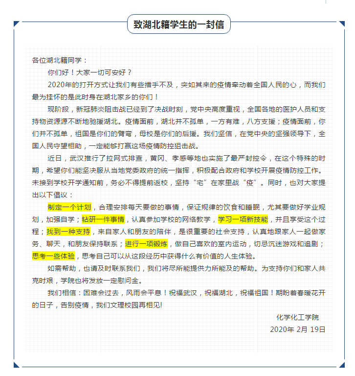 为支持帮助湖北籍学生和家人共克时艰,学院向湖北籍学生发放了暖心慰问金,做好了线上教学的安排,同时发出了充满温情的《致湖北籍学生的一封信》,在信中给予了湖北学子更多鼓励,希望他们在决战时刻能增强信心、保持定力,同时也提出了规划学习、调整心态的倡议。