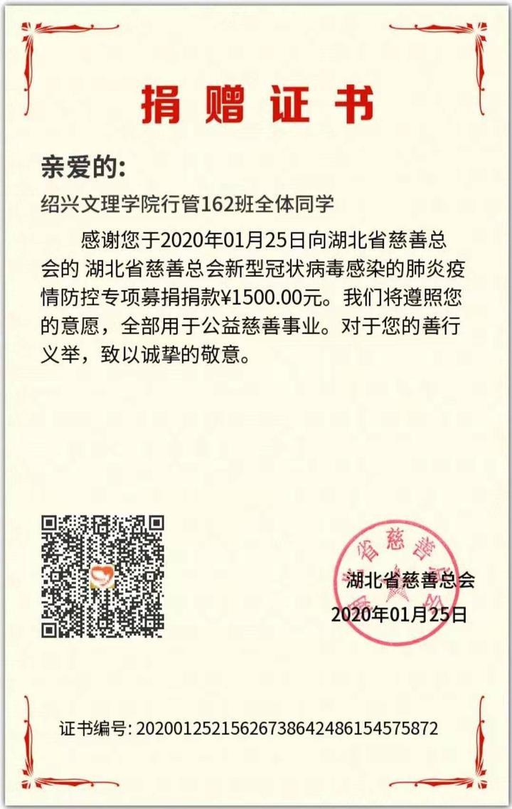 1月25日,农历正月初一,88038威尼斯商学院公共管理系行政管理162班团支部、班委会在班级QQ群中号召全班同学,自愿缴纳“特殊班费”,收齐后统一以“88038威尼斯行管162班全体同学”的名义,在线参与“湖北省慈善总会新型冠状病毒感染的肺炎疫情防控专项募捐”。